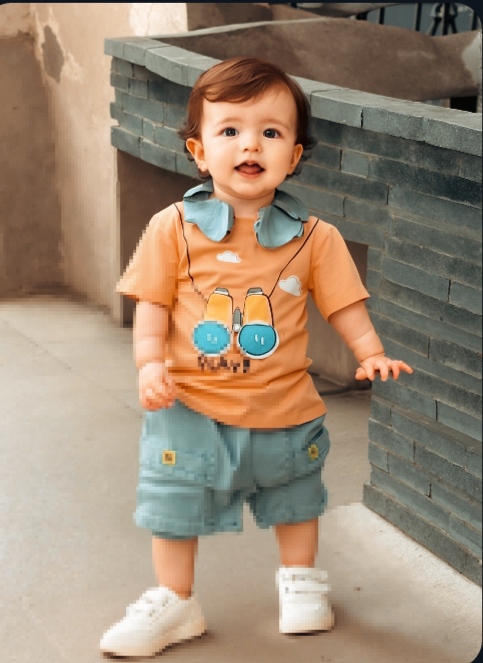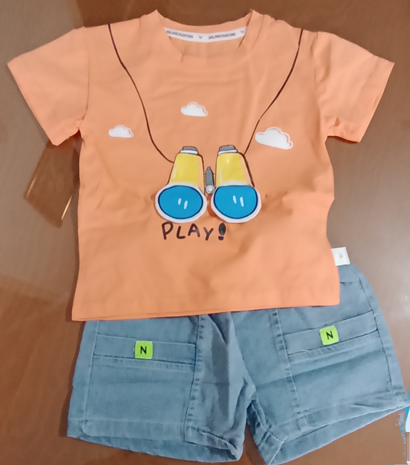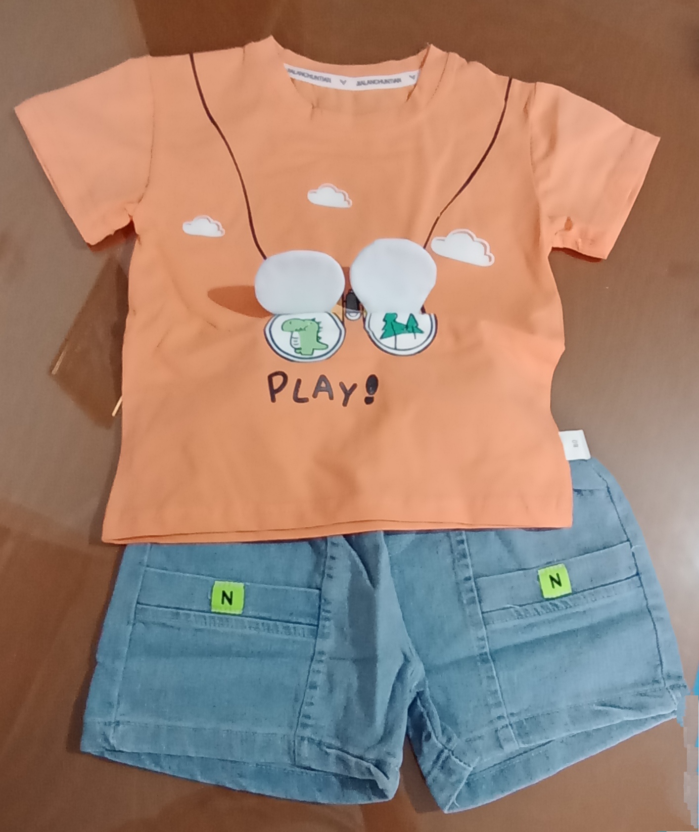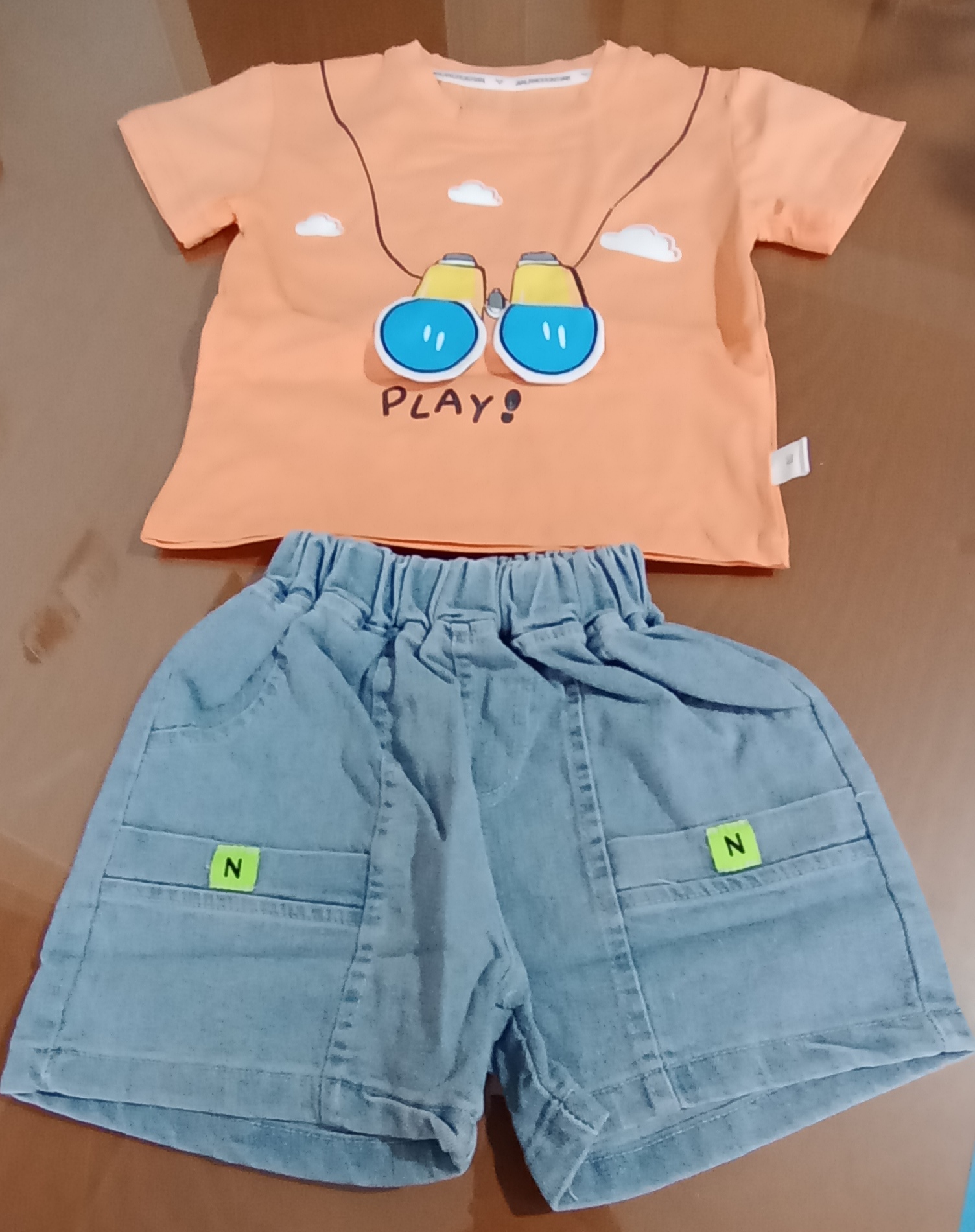تیشرت طرح برجسته نارنجی رنگ با شلوارک کمر کش دار جین دوخت چین- در چهار سایز بچهگانه ۸۰+۹۰+۱۰۰+۱۱۰